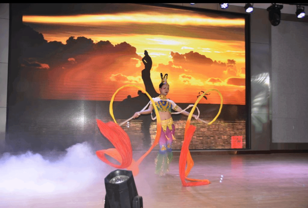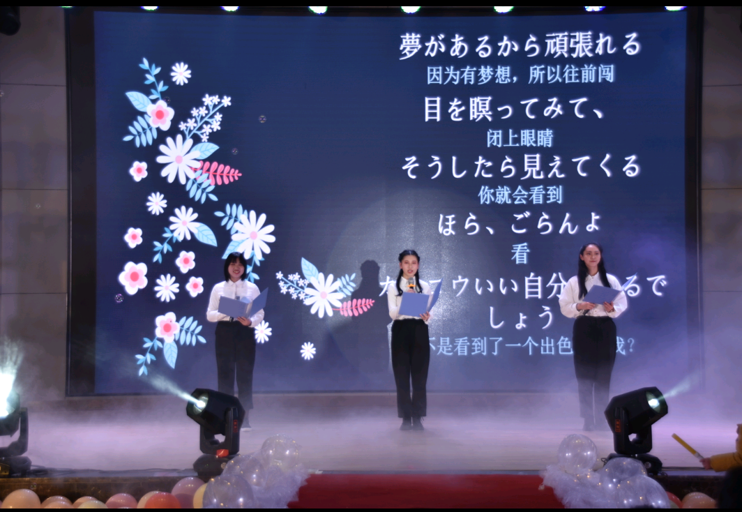 精彩不断,逐梦在航。“我们都是追梦人,在今天勇敢向未来报道……”苏公志、高金轩等四位团学部长带领现场同学为梦想高歌;19级同学李佳壕带来优雅典丽的民族舞《飞天》,捻指垂暮的步态生莲,配以乘风起舞的飞天长绸,惊艳全场观众;反映警惕防范老员工网贷、沉迷打游戏现象、端正学习态度等校园生活为主题的小品、相声,幽默诙谐,在逗得全场观众捧腹大笑的同时,极具教育意义,引发同学们的深思;英语短剧《My Fair Lady》、日语朗诵展现外院学子极强的外语综合运用能力;此外更有二胡独奏经典曲目《赛马》、笛子独奏、吉他合奏等器乐表演纷繁精彩的现场演绎。晚会在全体团学干部合唱《我和我的祖国》的歌声中走向尾声,红旗飘飘,外院学子挥动的是手中如火般的红帜,坚定的是心中对青春未来的无尽期望。