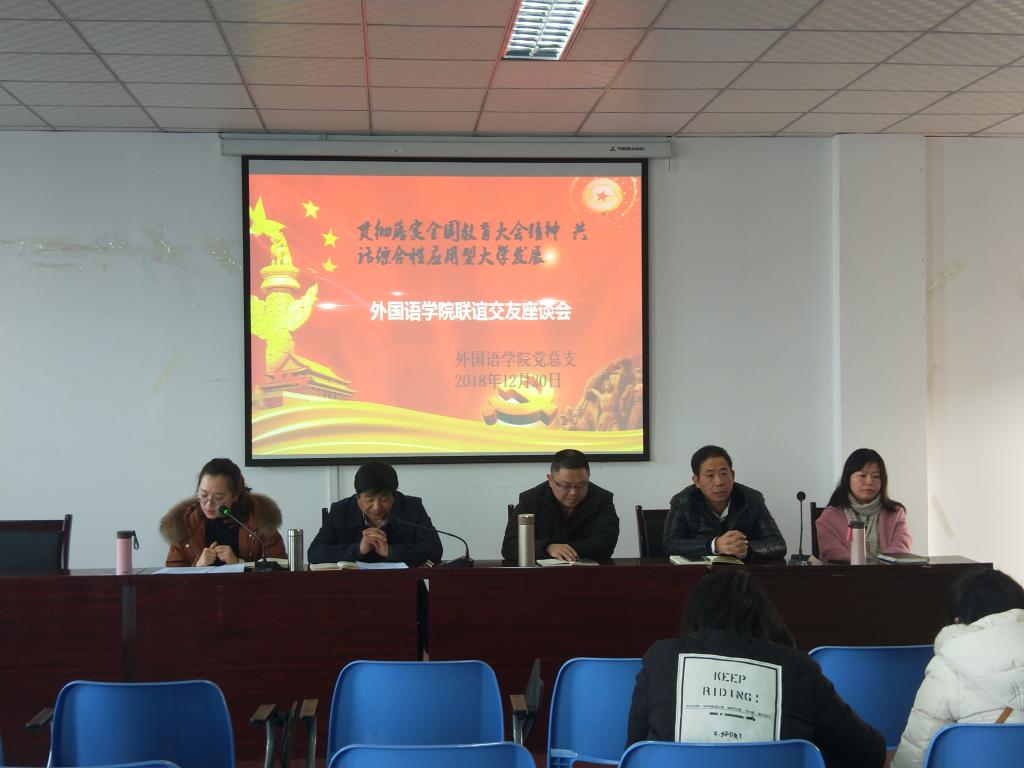 2018年12月20日下午四点,公司党总支在明辨楼1栋604举行联谊交友座谈会议,贯彻落实全国教育大会精神,共话应用型高水平大学建设。参加会议的有公司班子成员、民主党派教师代表、少数民族教师代表、侨联教师代表、分工会委员及工会小组组长。此次会议由党总支书记甘长银主持。