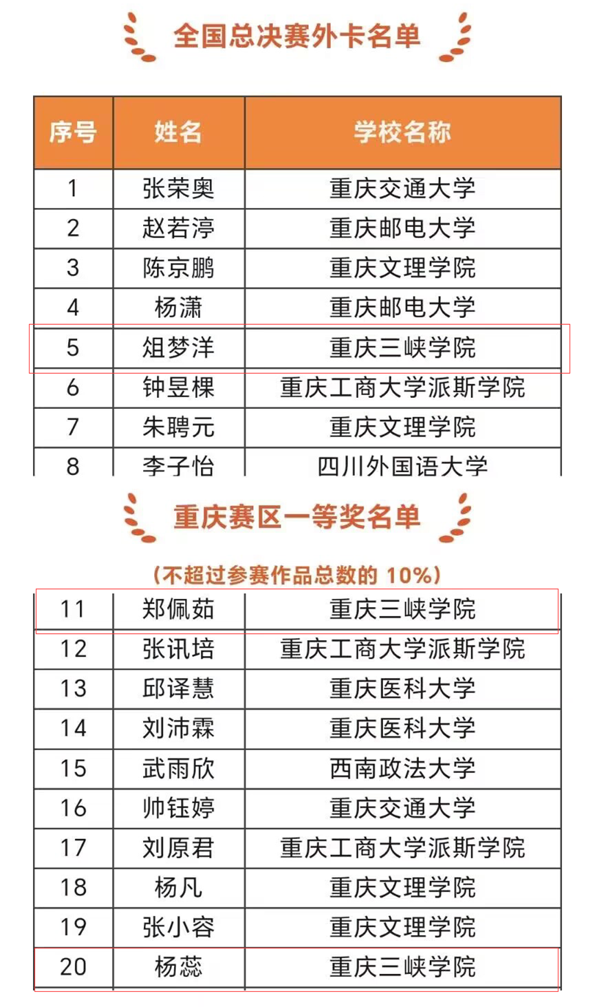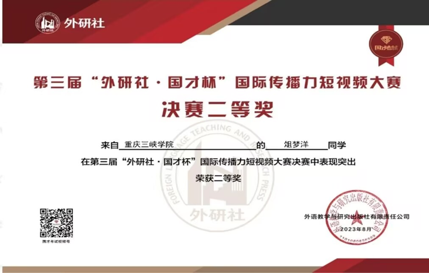 8月28日,第三届“外研社·国才杯”国际传播力短视频大赛全国决赛圆满落幕。公司英语专业2022级俎梦洋团队(2019级周毫;2021级美院訾杨;2022级李嘉昊;2022级颜明栩)荣获全国决赛二等奖,2022级杨蕊(2019级吴永琪;2021级毛皓龙;2022级谢文婧;2022级袁子雯)、2021级郑佩茹团队(2021级王思颖;2021级杨媛茜)均获得重庆赛区一等奖,杨蔚、程谢两位指导老师荣获全国指导教师二等奖。