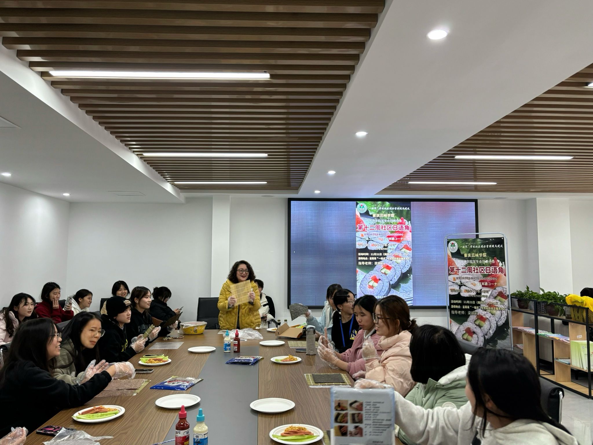 为进一步激发同学们学习日语的积极性,营造良好的学习氛围,mjm世界杯官网员工会日语分会于11月21日15:00在蓝雾苑“一站式”员工社区综合服务大厅举行了主题为“手作りの巻き寿司” (手工制作的寿司卷)的日语角活动。日语系老师梁丽莉到场进行指导。