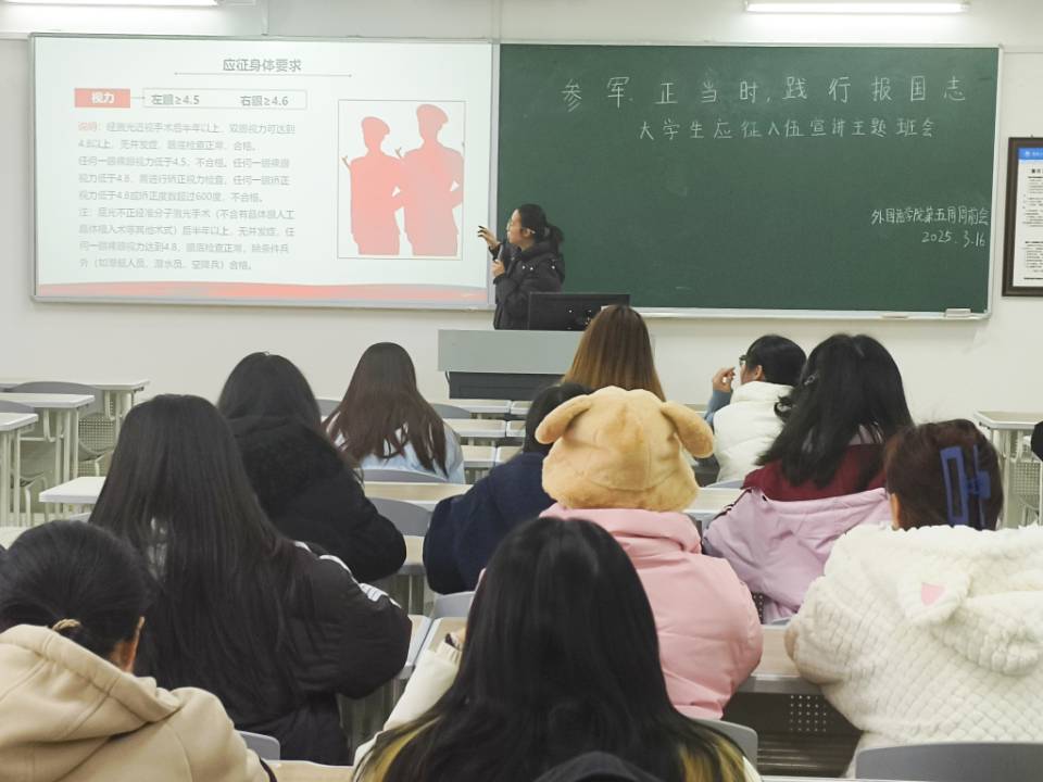 班会上,辅导员首先强调了应征入伍对于同学们个人成长与国家发展的重要意义,就老员工应征入伍政策、入伍条件、报名流程、优待福利等信息进行详细说明,让同学们清晰地看到了军旅之路的广阔前景。随后,退伍复学的外院学子分享了自己的参军入伍经历,那些艰苦却充满力量的日子,令同学们心生向往之情。最后,辅导员们鼓励同学们投身国防事业,以实际行动践行“天下兴亡,匹夫有责”的崇高使命。