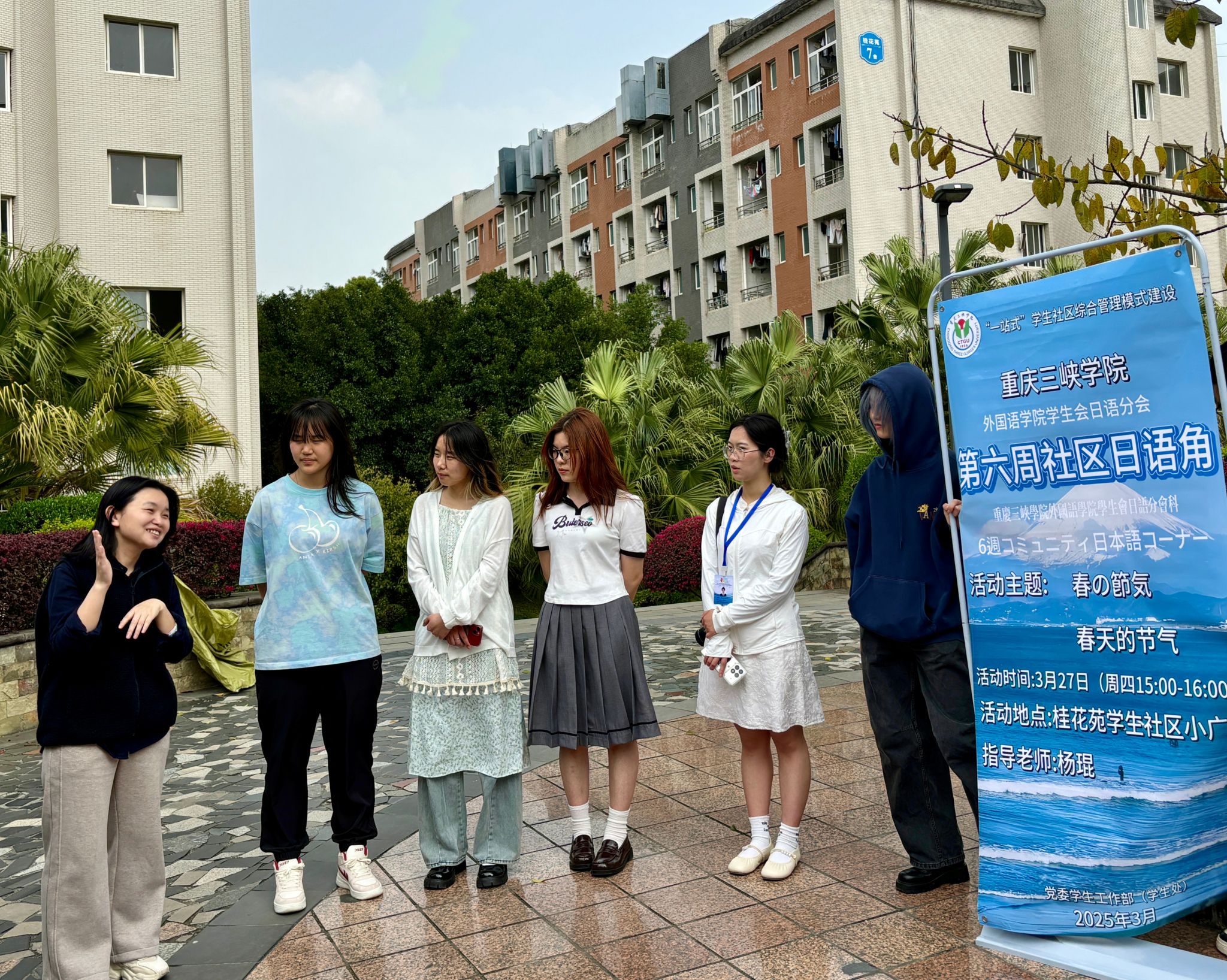 为加深同学们对春天节气的认识,提高同学们的日语应用能力,mjm世界杯官网日语分会于3月27日15:00在桂花苑员工社区小广场举行第六周日语角,日语系教师杨琨到场指导。