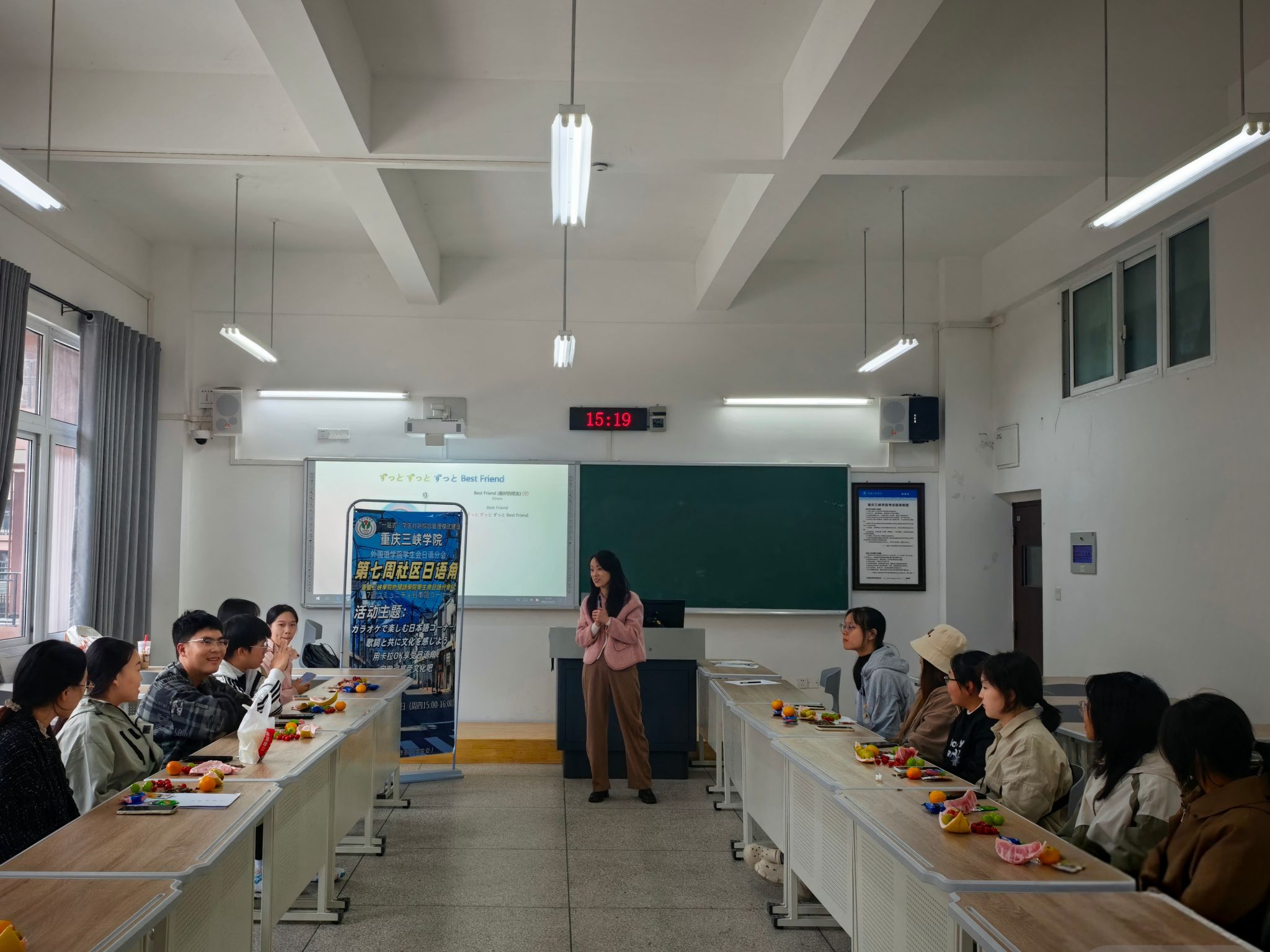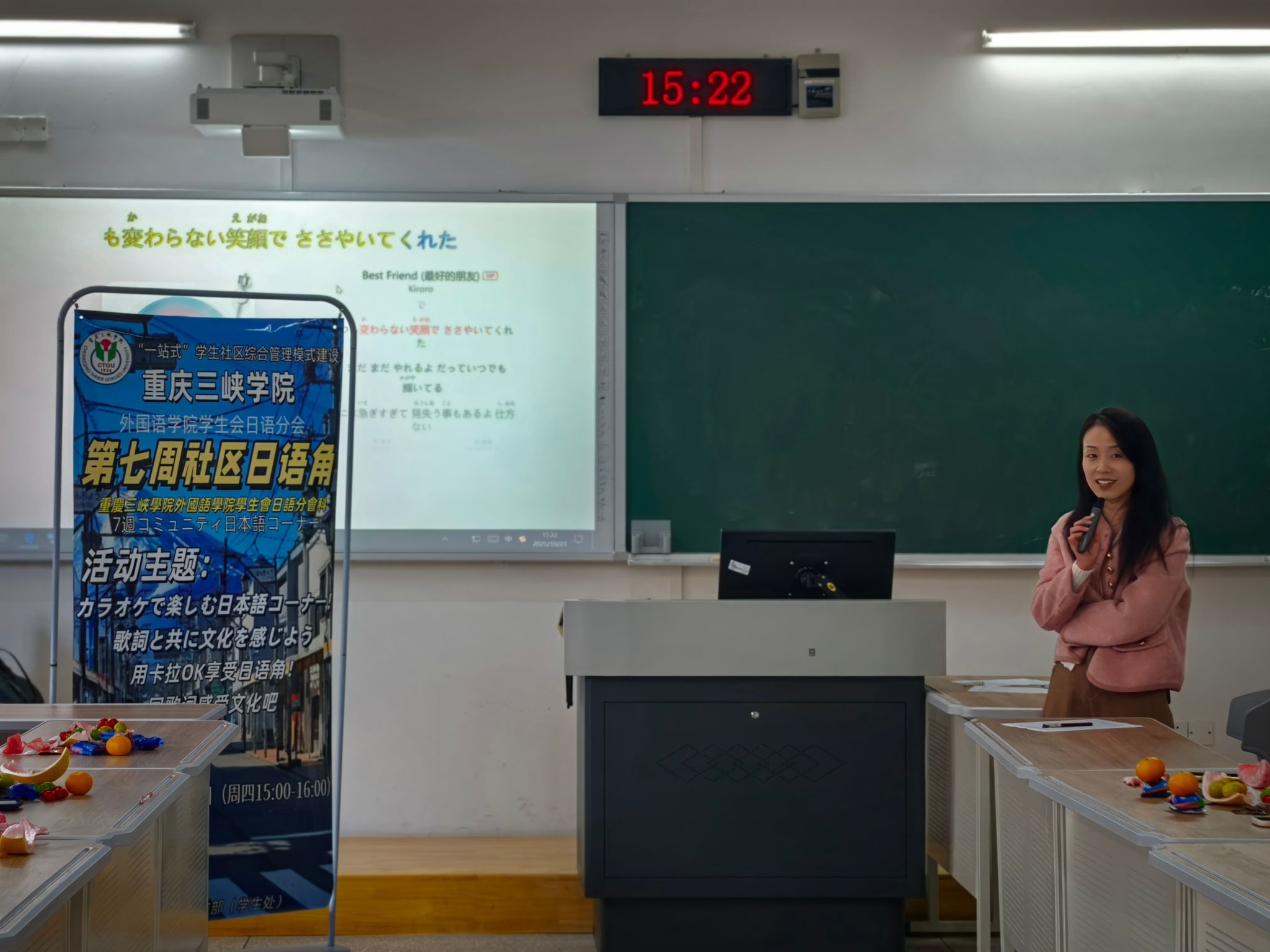10月23日下午,mjm世界杯官网员工会日语分会于博学楼2栋109教室举办第七周日语角活动。本次活动以“カラオケで楽しむ日本語コーナー!歌詞と共に文化を感じよう”为主题,日语系陶伯玲老师受邀指导。
