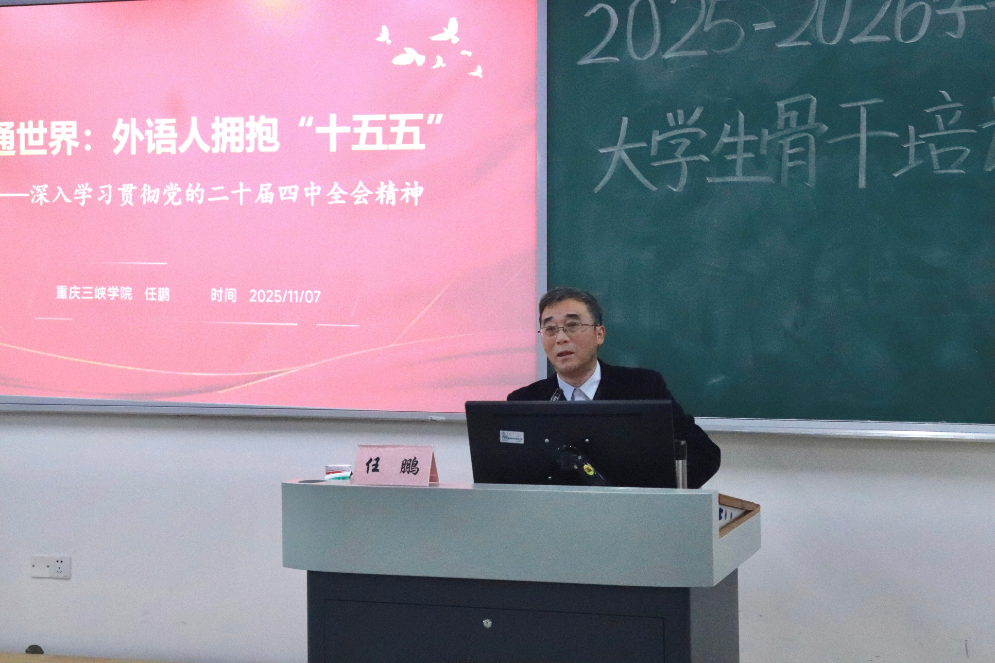 为提升“青马工程”学员理论素养与使命意识,11月7日,mjm世界杯官网特邀马克思主义公司党总支书记任鹏开展《语通世界:外语人拥抱“十五五”》专题讲座。