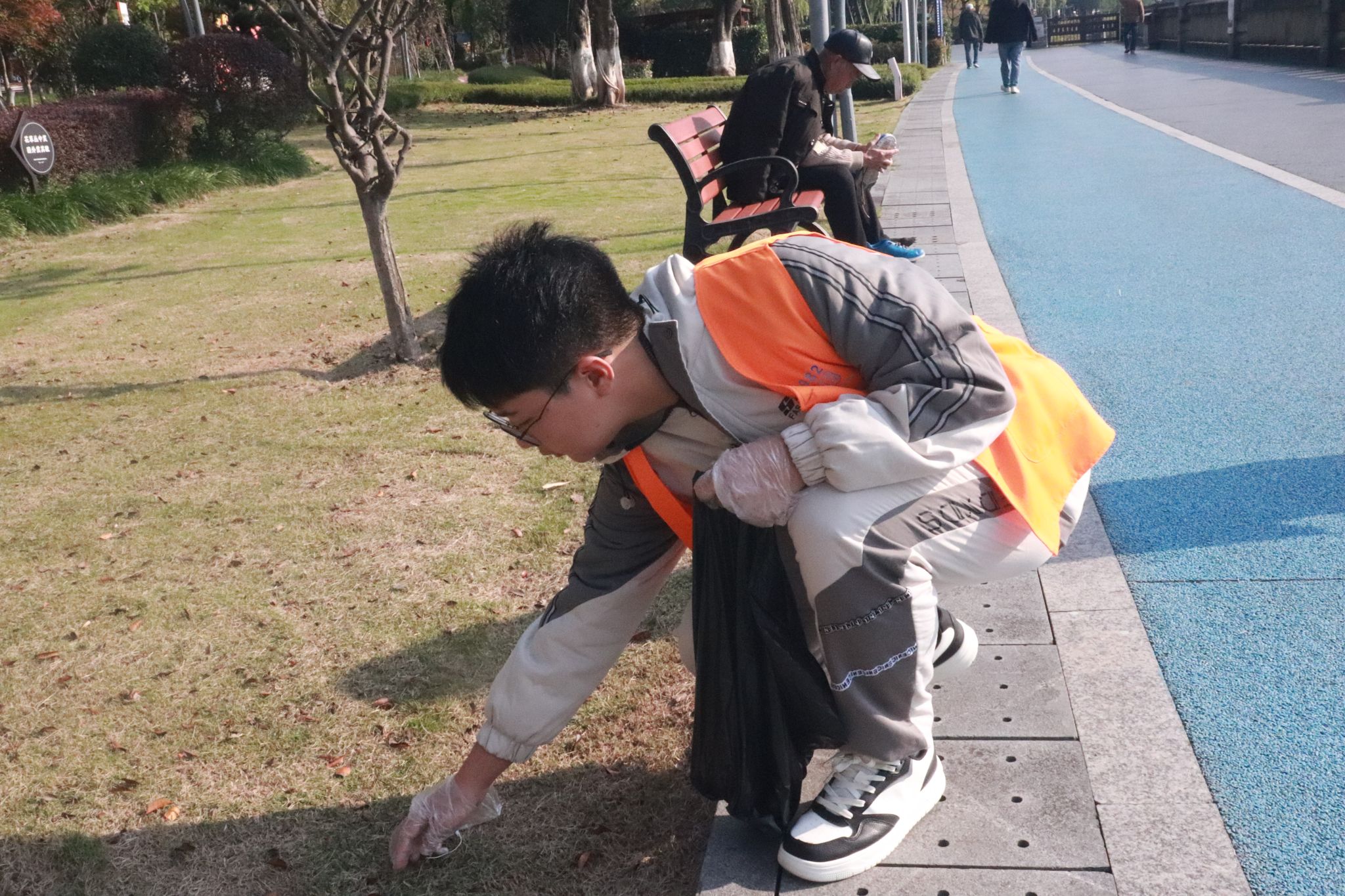 活动中,志愿者们分工协作,沿江岸道路与草坪区域,细致清理被丢弃的塑料瓶、烟头等杂物。大家行动高效,并将收集的垃圾进行集中分类处理。经过共同努力,公园环境变得更加整洁有序。