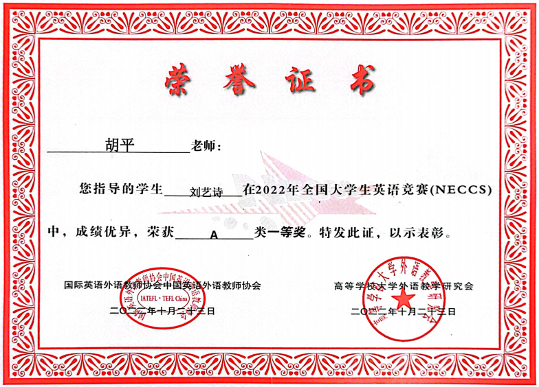 公司胡平老师指导的员工刘艺诗在2022年全国老员工英语竞赛(NECCS)中,成绩优异,荣获A类一等奖.公司向此表示热烈的祝贺!