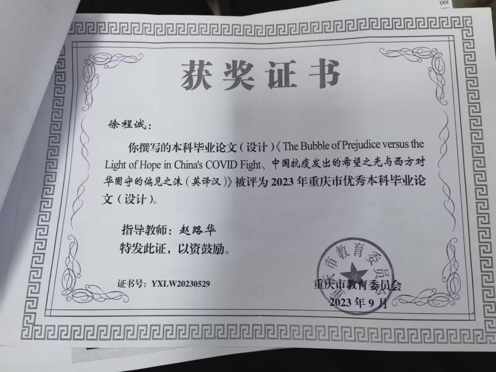 公司赵路华老师指导的员工徐程诚撰写的本科毕业论文(设计)《The Bubble of Prejudice versus theLight of Hope in China's COVID Fight、中国抗疫发出的希望之光与西方对华固守的偏见之沫(英译汉)》被评为2023年重庆市优秀本科毕业论文(设计)。公司向此表示热烈的祝贺!