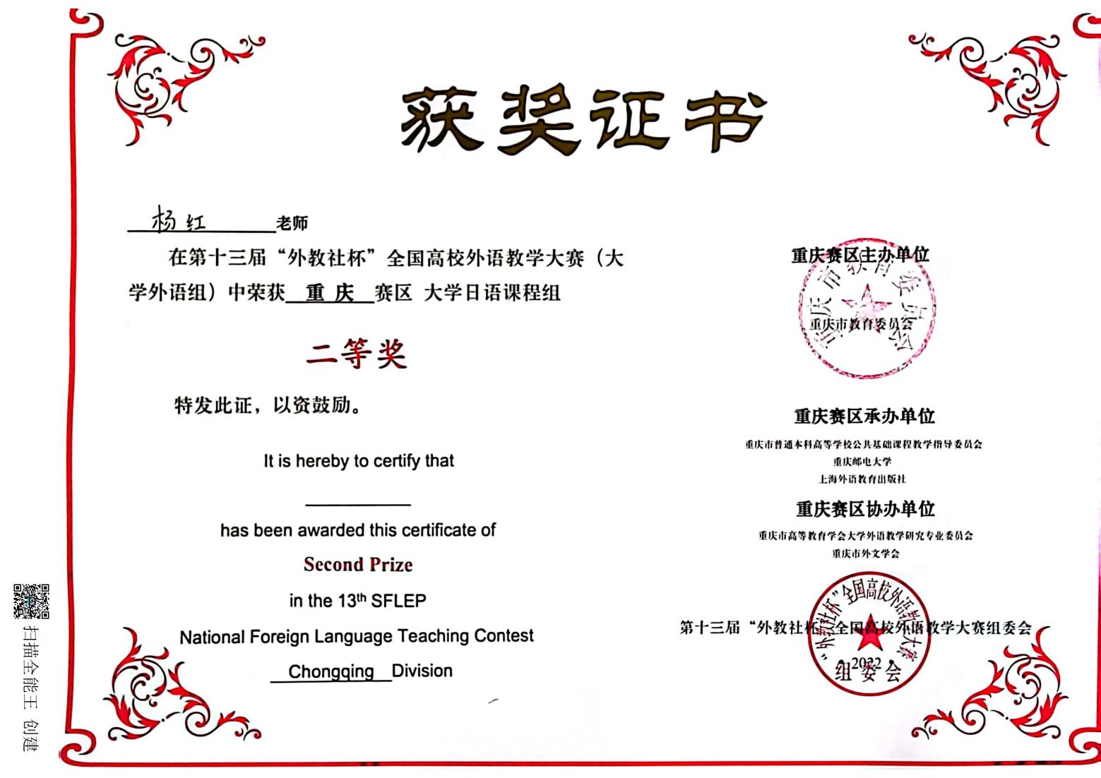 公司杨红老师在第十三届“外教社杯”全国高校外语教学大赛(大学外语组)中荣获重庆赛区大学日语课程组二等奖。公司向此表示热烈的祝贺!