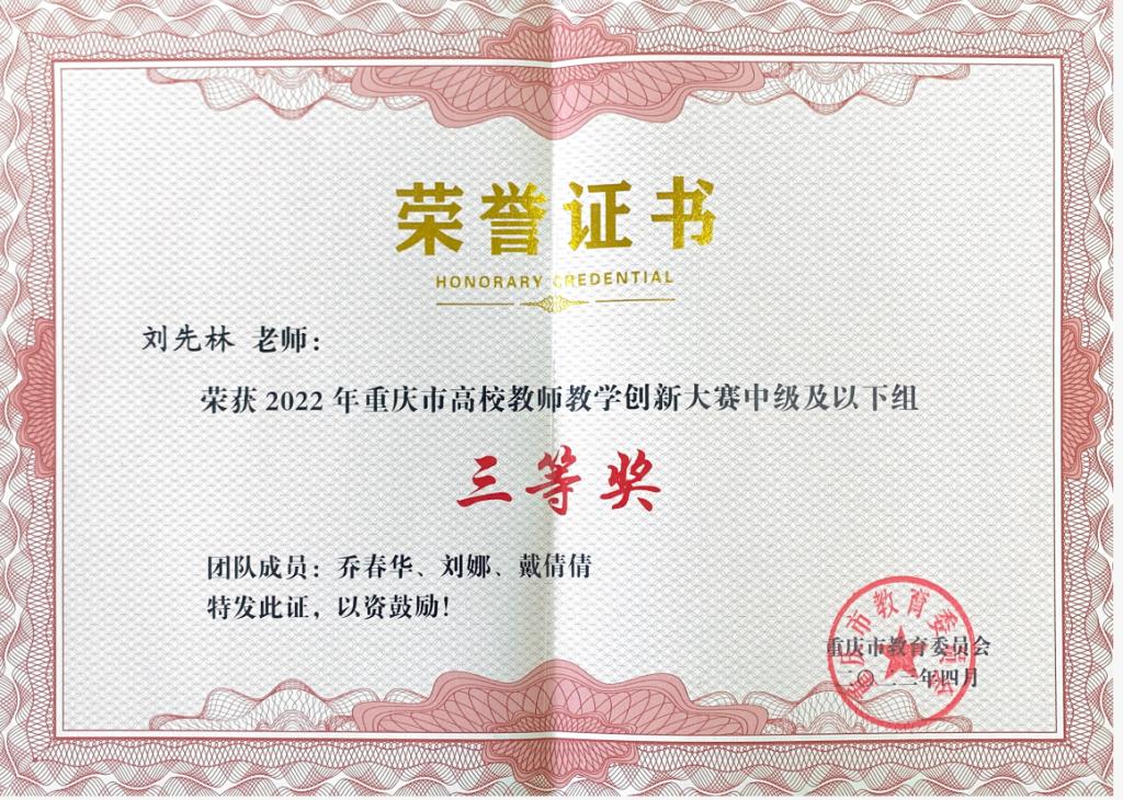 公司刘先林、乔春华、刘娜、戴倩倩老师荣获2022年重庆市高校教师教学创新大赛中级及以下组三等奖。公司向此表示热烈的祝贺!