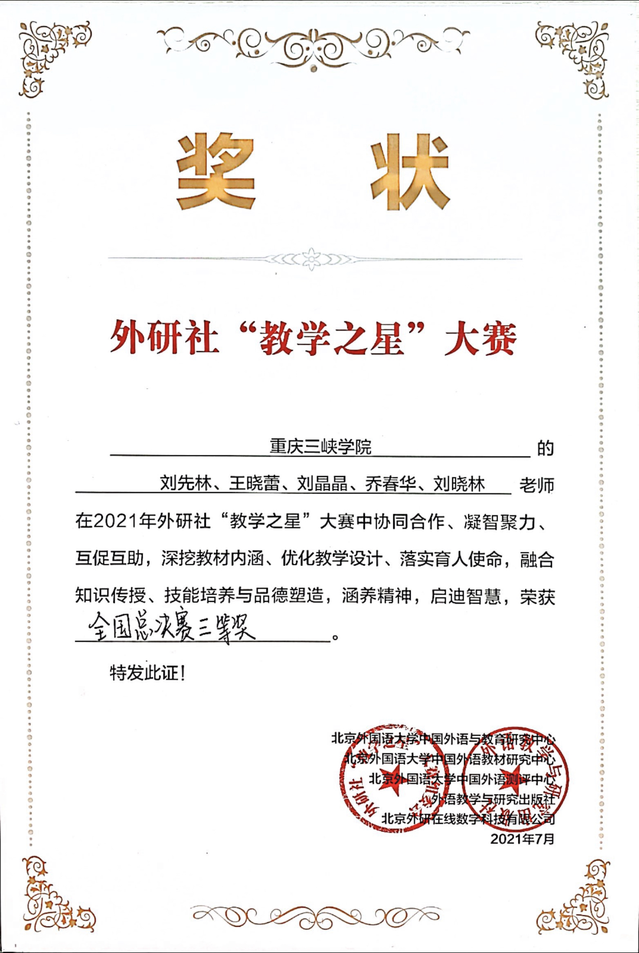 公司刘先林、王晓蕾、刘晶晶、乔春华、刘晓林老师在2021年外研社“教学之星”大赛中协同合作、凝智聚力、互促互助,深挖教材内涵、优化教学设计、落实育人使命,融合知识传授、技能培养与品德塑造,涵养精神,启迪智慧,荣获全国总决赛三等奖。公司向此表示热烈的祝贺!