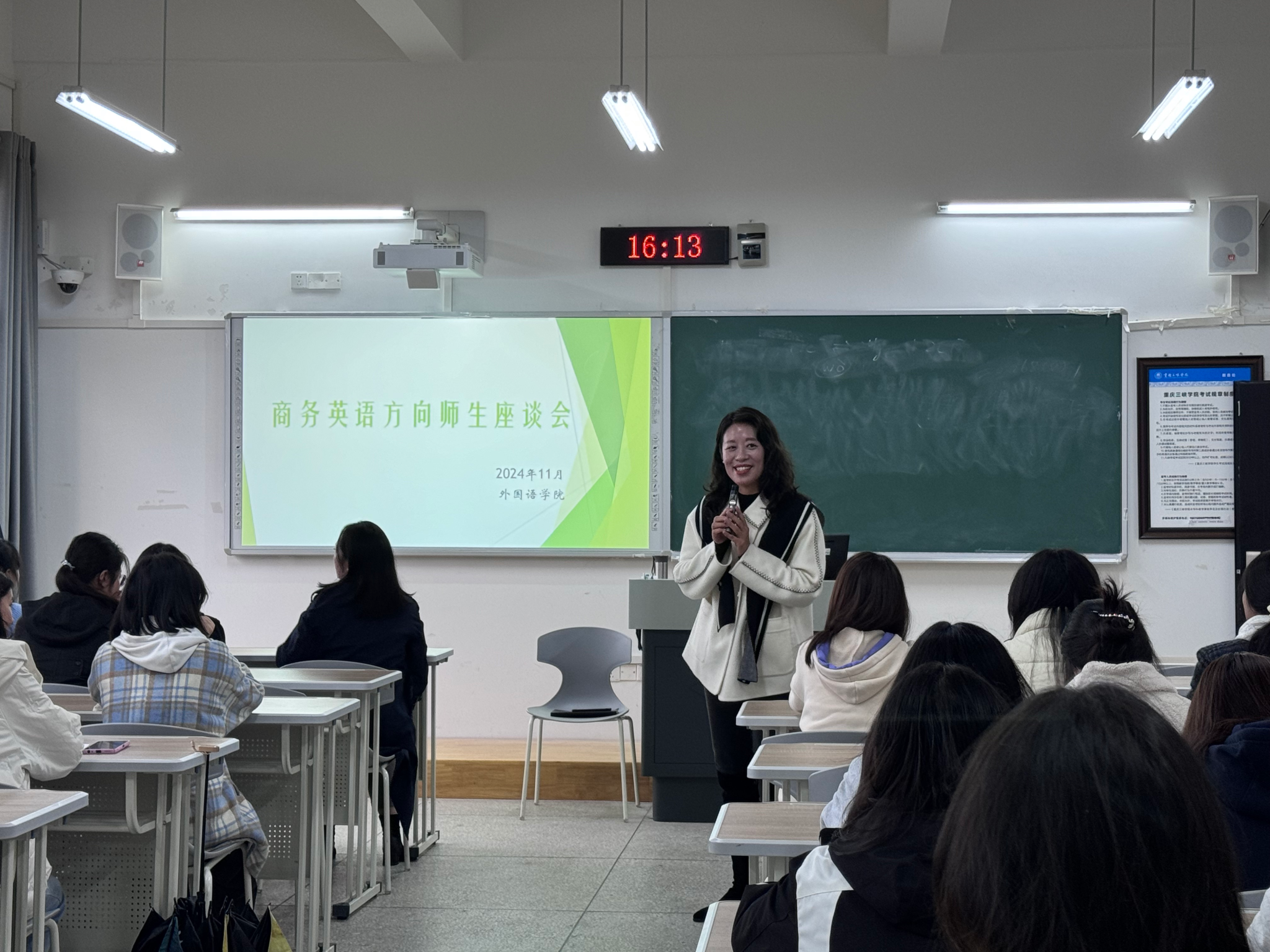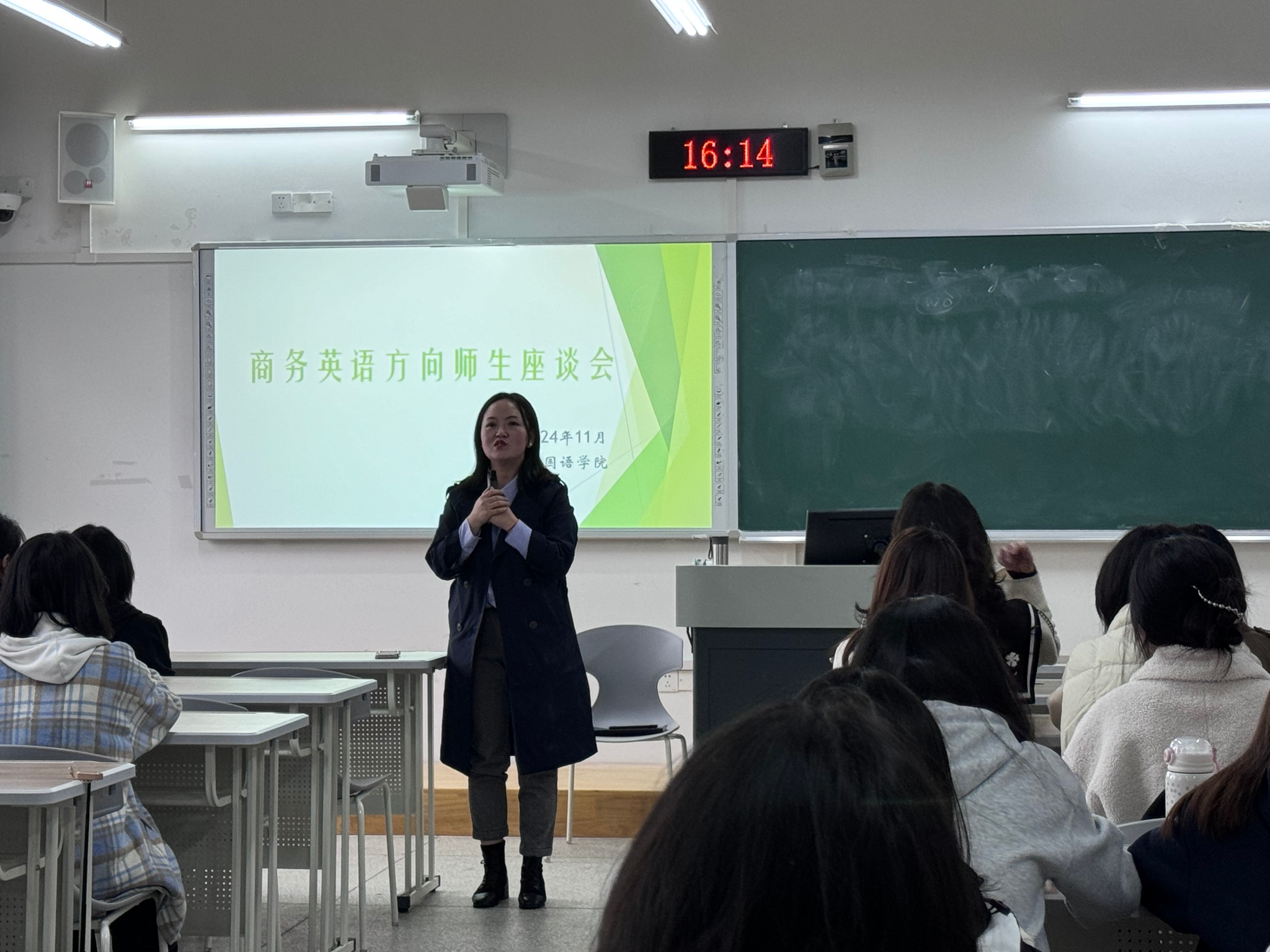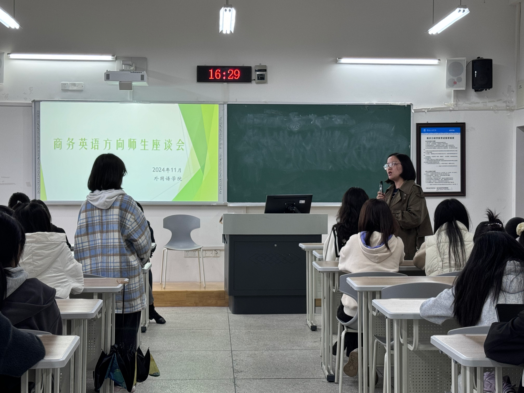 为进一步加强师生交流、了解员工学习生活等情况、帮助员工解决实际困难,公司2024年11月14日下午四点在博1-109举行了英语商务方向员工座谈会。24级、23级、22级商务方向员工代表参加了座谈会。出席座谈会的任课教师有孔云军、骆红亚、夏荥、涂艳等。座谈会由公司党总支副书记、副经理孔云军主持。