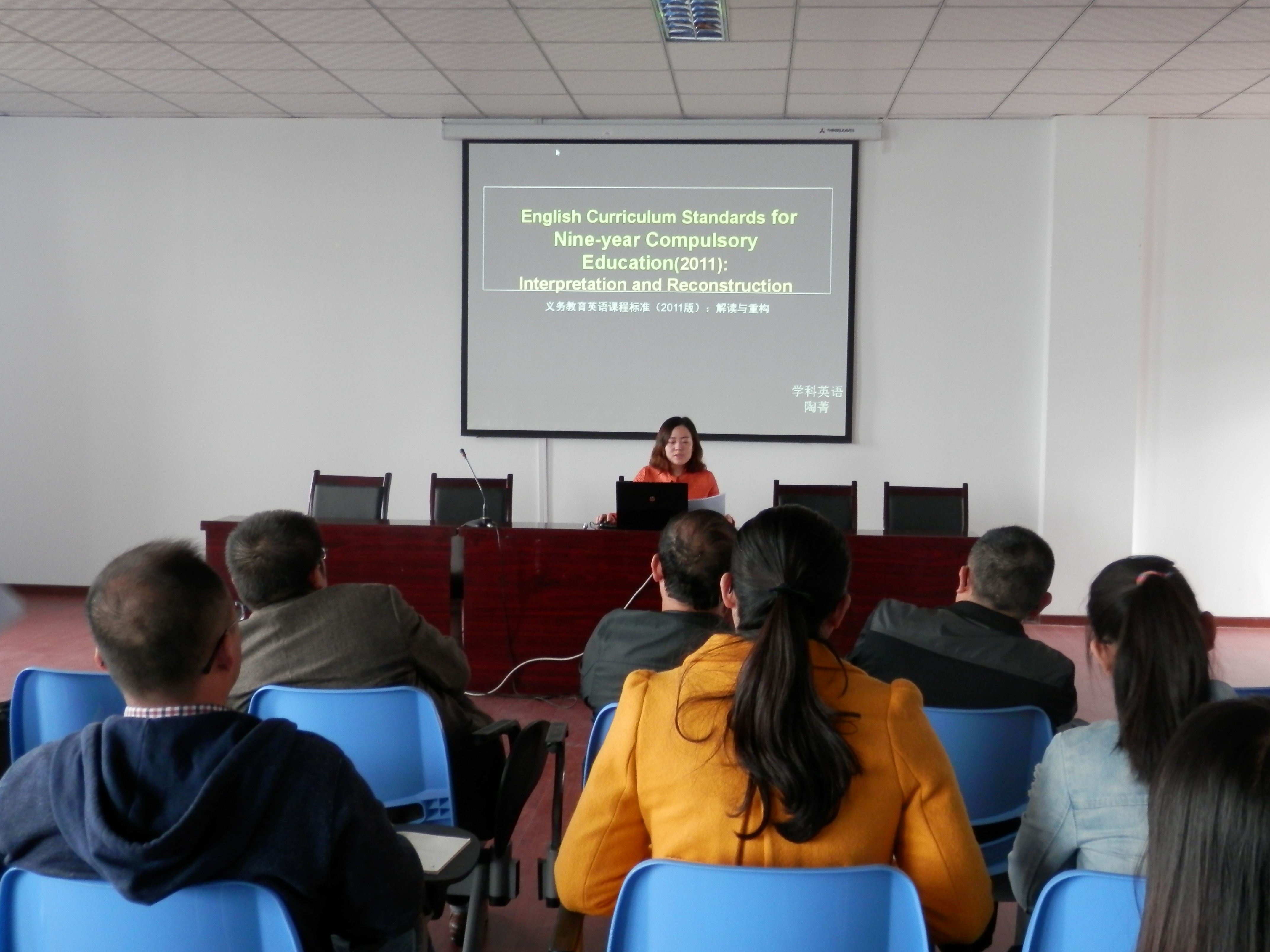 在开幕式结束之后,2015级研究生陶菁同学作了题为“义务教育英语课程标准(2011版):解读与重构”的学术研究报告。报告活动由mjm世界杯官网研究生导师许楠博士主持。陶菁从英语课程的总目标、分级目标描述、语言知识因素、视听时间和实施建议的部分内容等方面进行了解读,并阐述了自己对于“新课标”的独到见解。