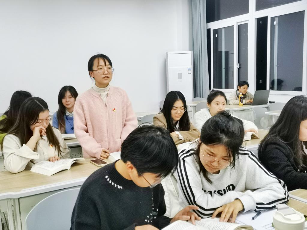 本次活动分两个环节。首先,胡靖璇带领大家学习了习近平总书记关于贯彻新发展理念推动经济高质量发展的重要论述,进一步理解领会总书记在浙江考察调研时强调的“始终干在实处走在前列勇立潮头 奋力谱写中国式现代化浙江新篇章”的重大意义。接着,参会党员围绕“身为青年党员应该如何践行新发展理念”这一内容展开交流。胡海峡说:“身为青年党员,要有敢闯的勇气和锐意进取的精神,跳出自己的‘舒适区’,勇立时代潮头,做科技创新、自立自强的先锋。”易柔辰说:“绿色是永续发展的必要条件和人民对美好生活向往的重要体现,身为青年党员,在日常生活中,应起到带头作用,积极引导同学们树立环保意识,并积极践行。”