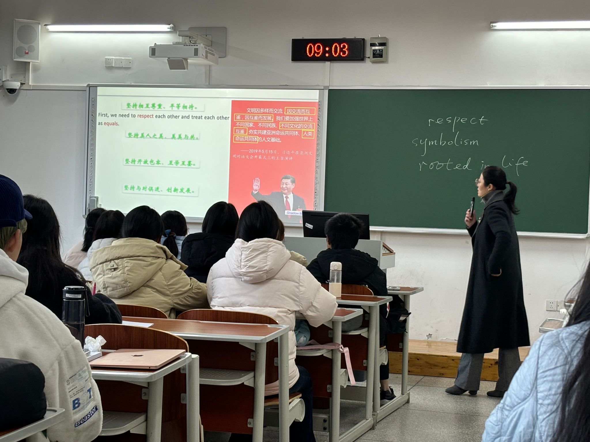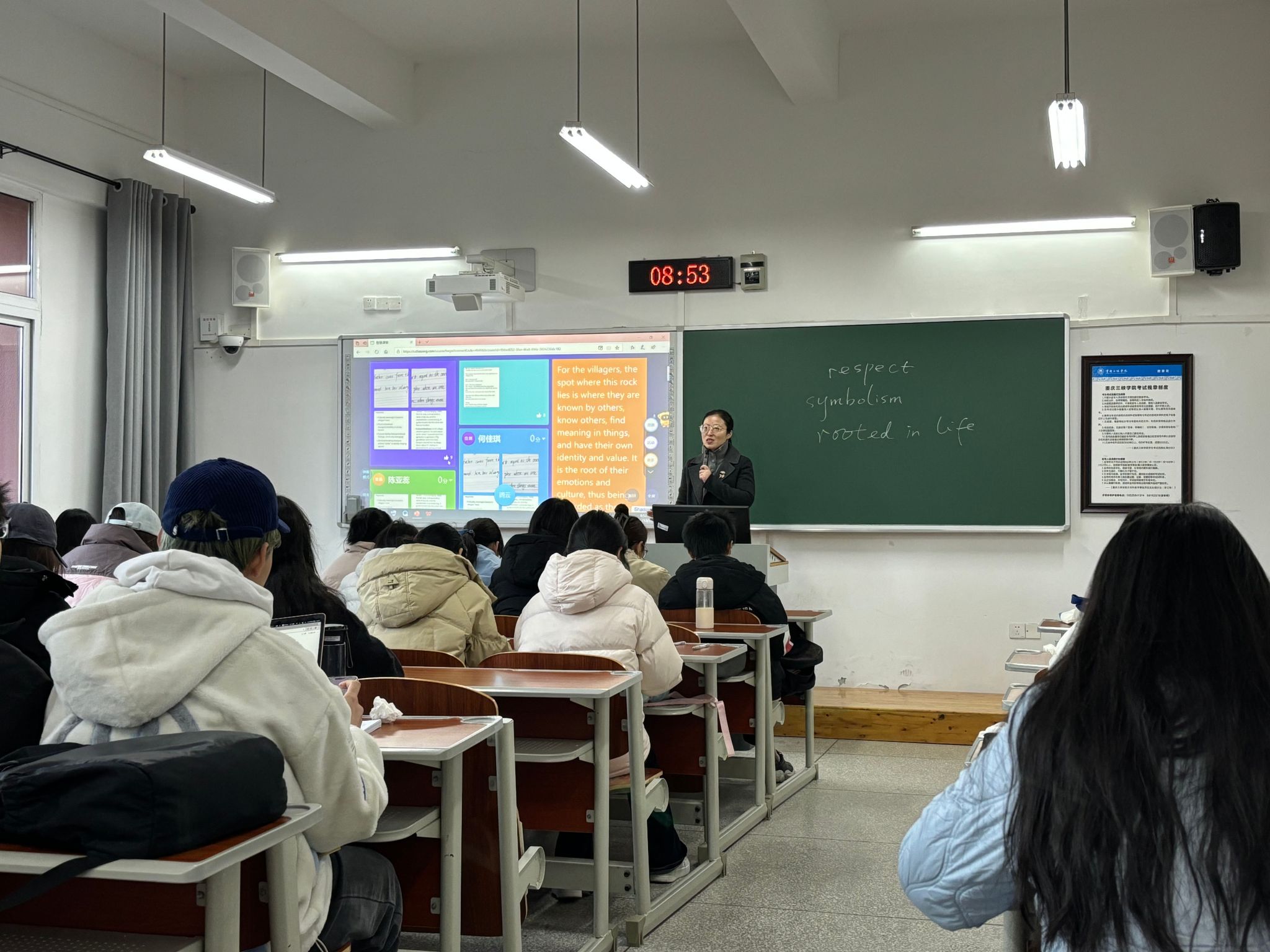 2025年12月26日上午,重庆市混合式一流课程《基础英语》教学团队成员刘娜老师,在博学楼2栋303教室呈现了一节技术与人文深度融合的公开课。课程以经典课文Green Banana中“标志世界中心的石头”为支点,依托市级一流课程建设的线上资源平台与AI智能工具,引导员工展开了一场贯通虚实、跨越文化的探究之旅。